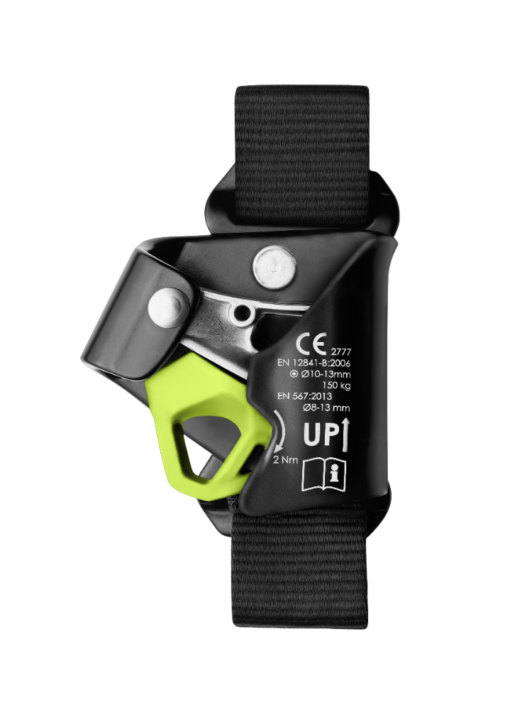 Model współpracuje z linami kernmantle o średnicy od 8,0 do 13,0 mm, dzięki czemu znajduje zastosowanie w szerokim zakresie konfiguracji sprzętowych. Zębatki zostały zaprojektowane tak, aby zapewniać optymalny chwyt również na linach oblodzonych lub zabrudzonych błotem, co poprawia skuteczność działania w trudniejszych warunkach terenowych i roboczych. Modułowa konstrukcja z płytką mocującą oraz tekstylnymi pętlami mocującymi umożliwia łatwą integrację z różnymi systemami uprzęży piersiowych.