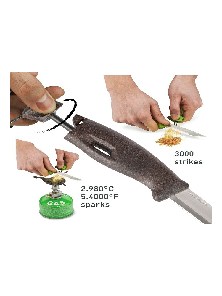 W rękojeści znajduje się krzesiwo Swedish FireSteel, które działa tak samo, niezależnie od warunków atmosferycznych.