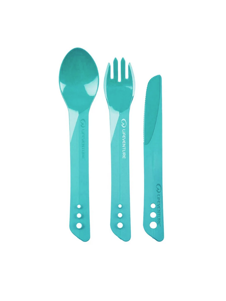 Sztućce wykonano z wytrzymałego tworzywa sztucznego, które dobrze znosi intensywne użytkowanie w terenie. Gładka powierzchnia wewnętrzna ułatwia czyszczenie, a odporność materiału pozwala na korzystanie zarówno w warunkach outdoorowych, jak i w codziennym użytkowaniu. Zestaw został wyprodukowany w Wielkiej Brytanii i nie zawiera BPA.