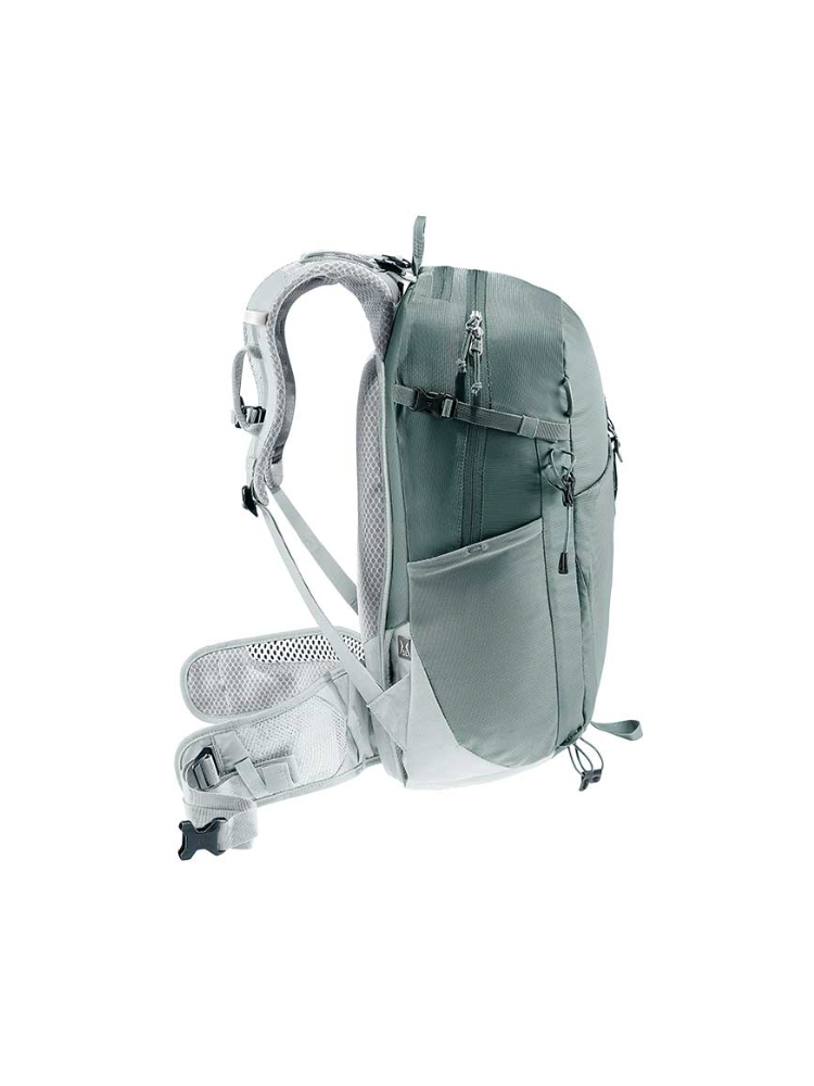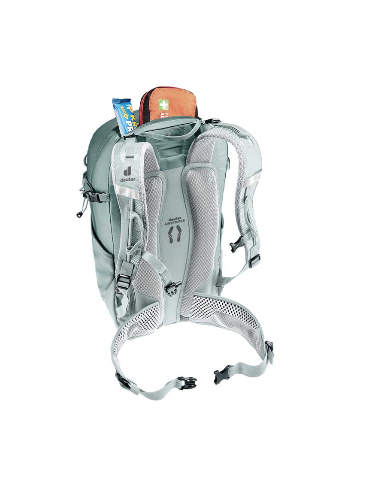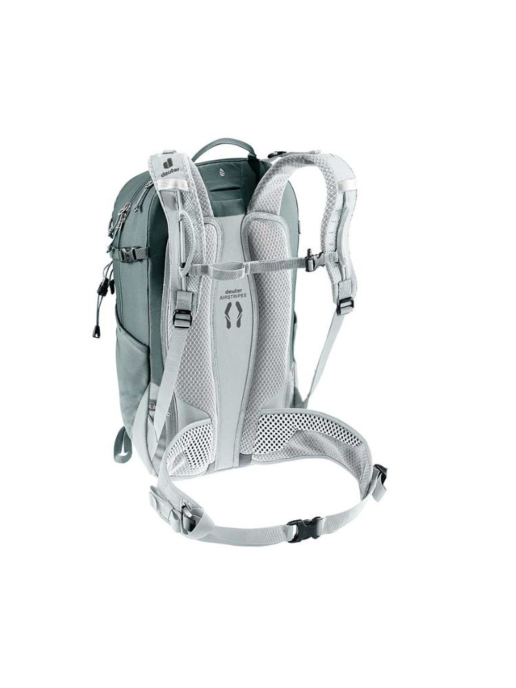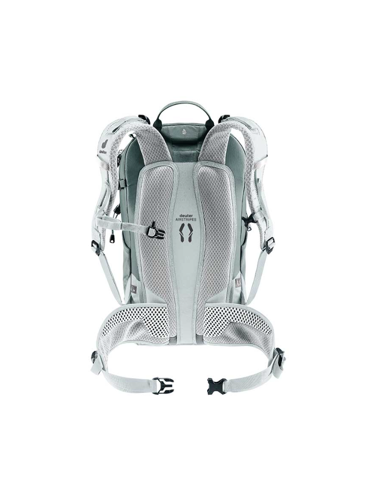 System nośny Deuter Airstripes oparty na dwóch rzędach poduszek z pianki pokrytej siatką Wide AirMesh zapewnia dobrą wentylację oraz stabilne przyleganie do pleców. Elastyczny pręt Delrin® wspiera przenoszenie obciążenia, a szelki ActiveFit dopasowują się do sylwetki użytkownika. Regulowany pas piersiowy z gwizdkiem oraz pas biodrowy z systemem Pull-Forward umożliwiają precyzyjne dopasowanie.