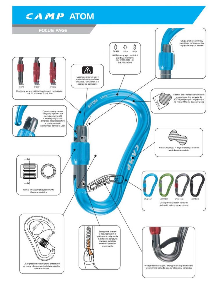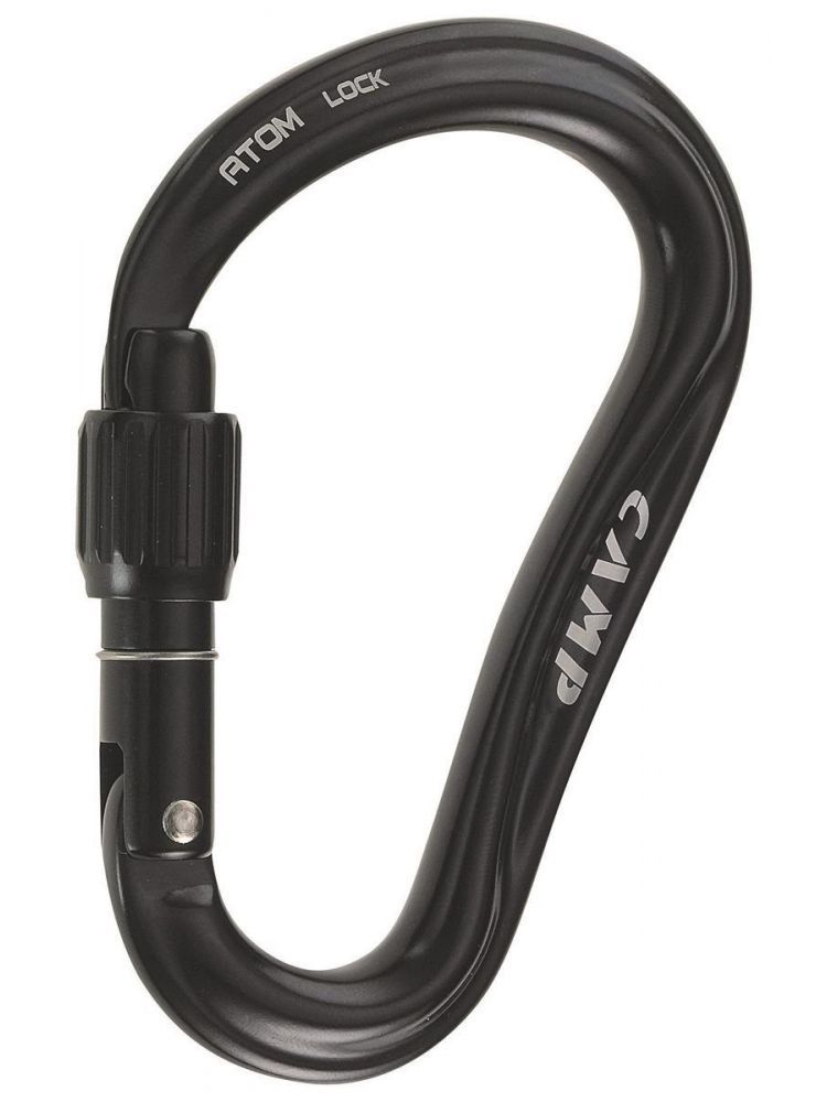 HMS Atom Lock marki Camp to nowoczesny karabinek wspinaczkowy z zakręcanym zamkiem, zaprojektowany do asekuracji i zjazdów. Dzięki zastosowaniu innowacyjnych rozwiązań, dużej wytrzymałości i prześwicie, model cieszy się dużą popularnością wśród najbardziej wymagających wspinaczy i alpinistów.