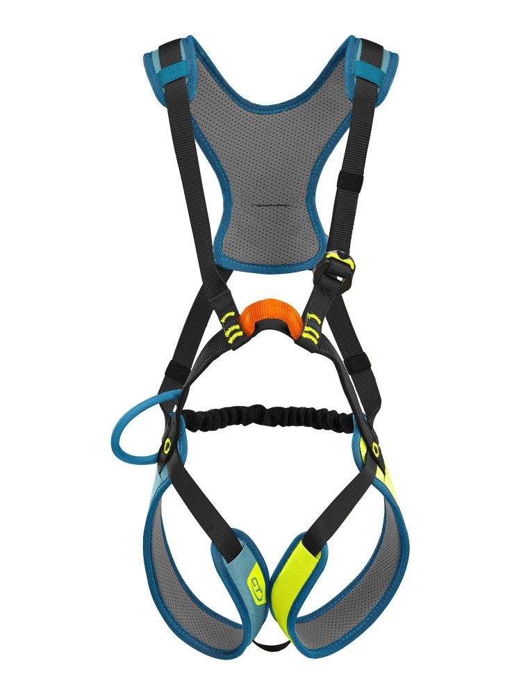 Uprząż wspinaczkowa Flik posiada dwa punkty wpinania. Przedni, oznaczony kolorem pomarańczowym, nie wymaga użycia dodatkowego łącznika do spięcia uprzęży. Dzięki temu rozwiązaniu, dziecko nie musi ściągać uprzęży podczas przerwy w treningach. Tylny punkt oznaczony został kolorem niebieskim i będzie przydatny jako zabezpieczenie dziecka na stromych i niebezpiecznych szlakach w górach. Cenny element stanowi także szpejarka do wpinania karabinków lub ekspresów.