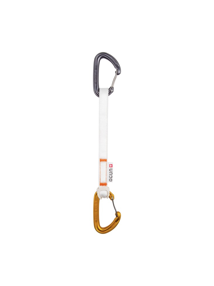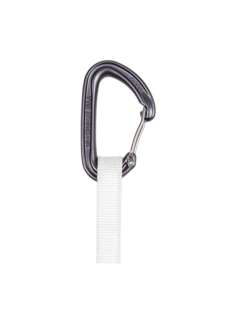 Zastosowana taśma Bio-Based Dyneema o szerokości 15 mm charakteryzuje się niską wagą i wysoką odpornością na obciążenia. Dolny karabinek został ustabilizowany gumką, co zapobiega jego przekręcaniu się i zwiększa komfort wpinania liny.